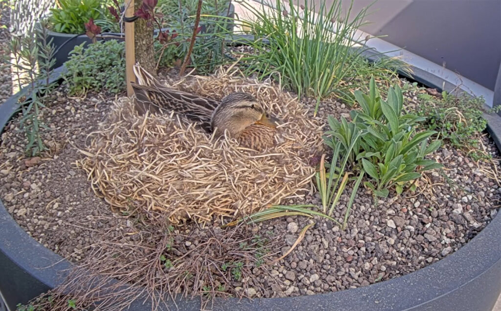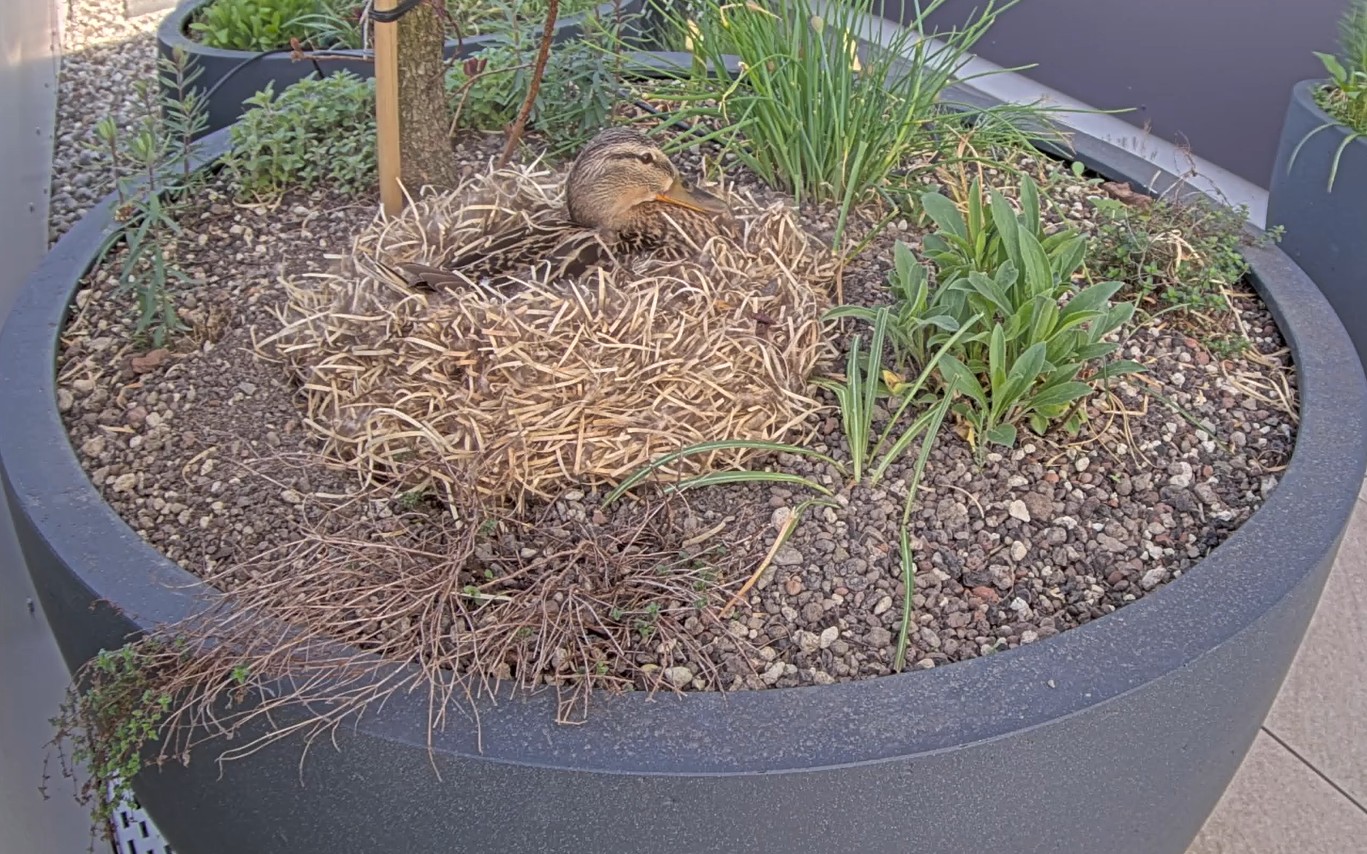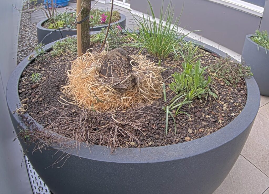 Die Freude ist riesig, dass das Ausbrüten gelungen ist und bereits sechs kleine Entenküken neugierig die Welt im Blumentopf erkunden. Da das Entenmami weiterhin geduldig auf dem Nest sitzen bleibt, gehen wir davon aus, dass noch weitere kleine Entenkinder ihre Eierschale durchbrechen werden.