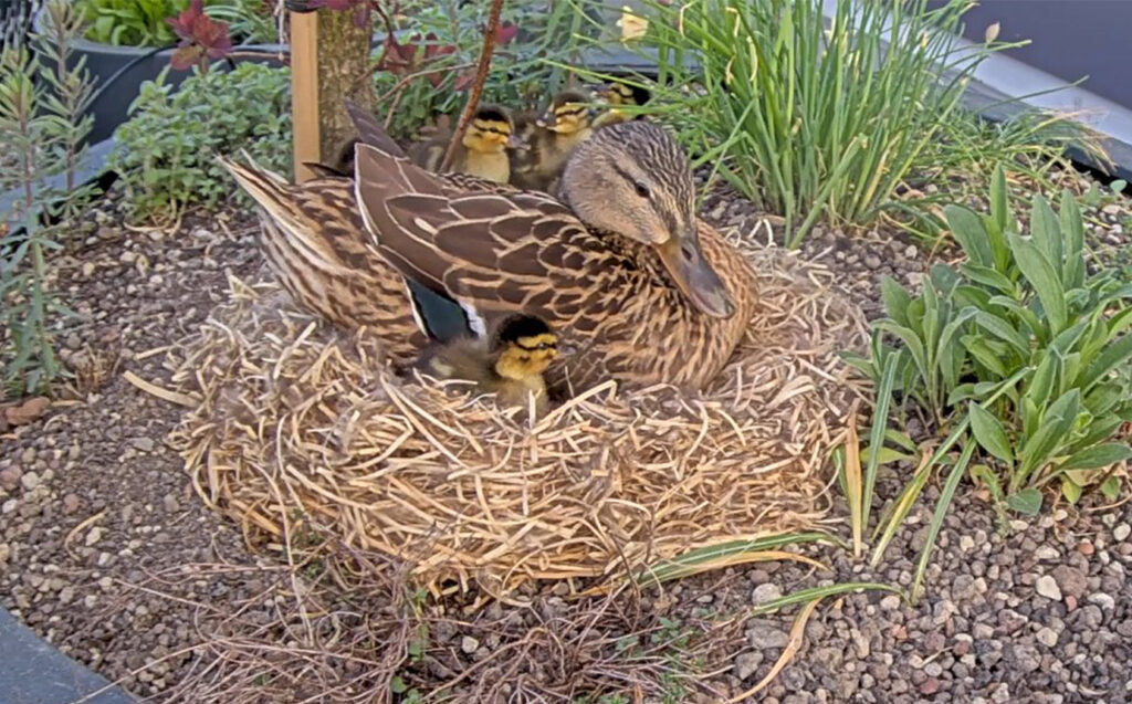 Es bleibt spannend, wie viele der flauschigen Entenkinder schlussendlich gemeinsam mit ihrem Mami den Weg zum nahe gelegenen Gewässer antreten werden. Mit grosser Freude beobachten wir dieses besondere Naturschauspiel, das wir aus nächster Nähe miterleben dürfen.